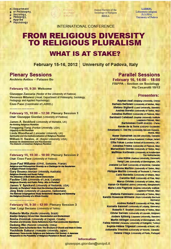 International Conference: “From Religious Diversity to Religious Pluralism: What is at Stake?” Posted on January 12, 2012 by DaBoss 15-16 February, 2012 at the University of Padova Share this:FacebookPocketEmailPrint